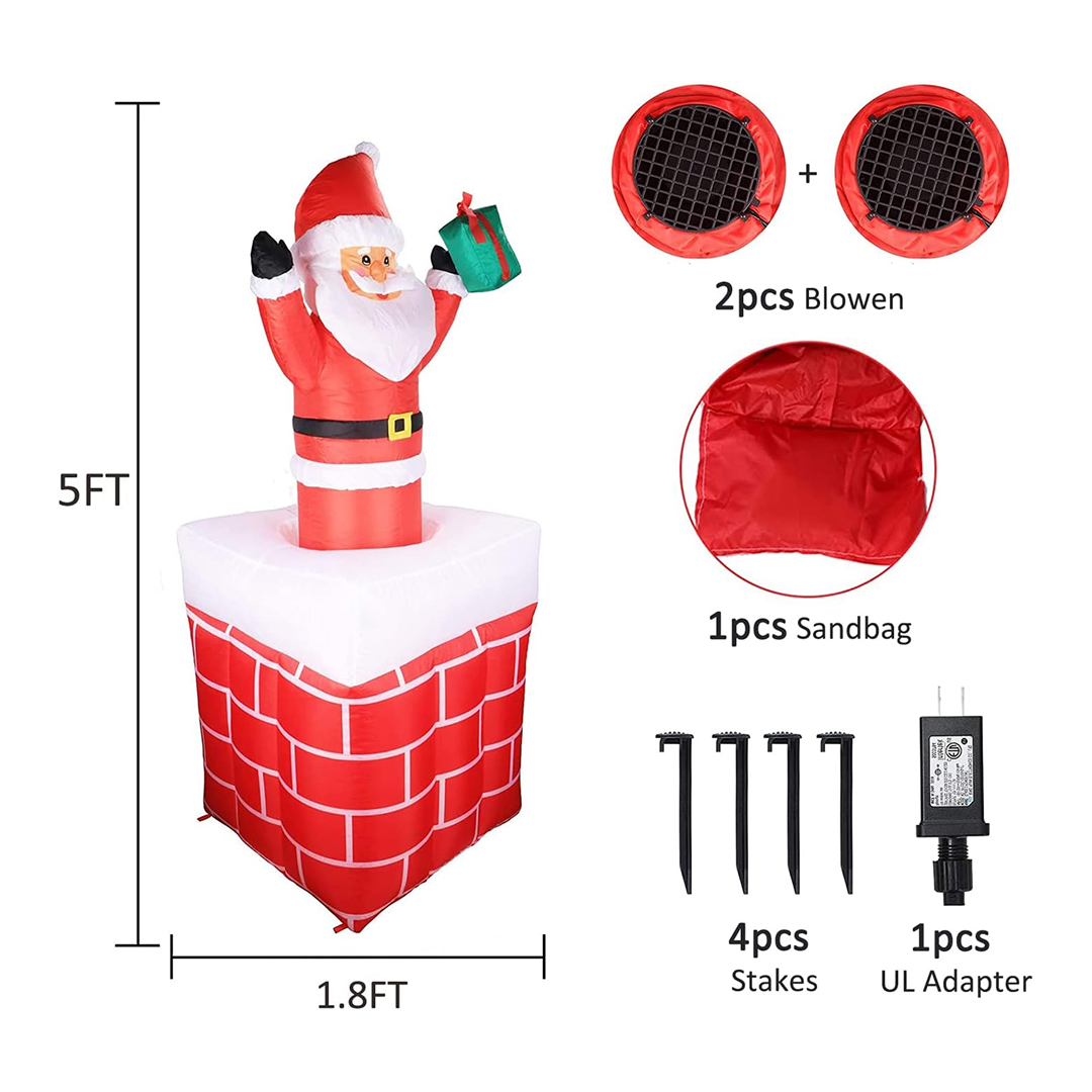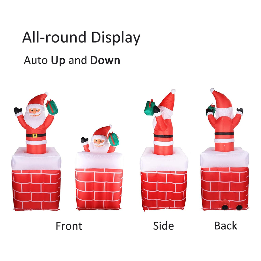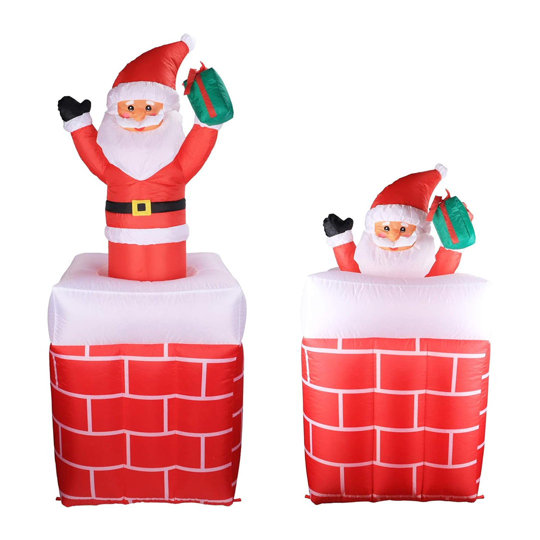 Christmas inflatable Santa Claus in a chimney outdoor decoration. These festive decorations are popular for adding holiday cheer to lawns and gardens, featuring built-in LED lights and often an animated mechanism where Santa moves up and down within the chimney structure.