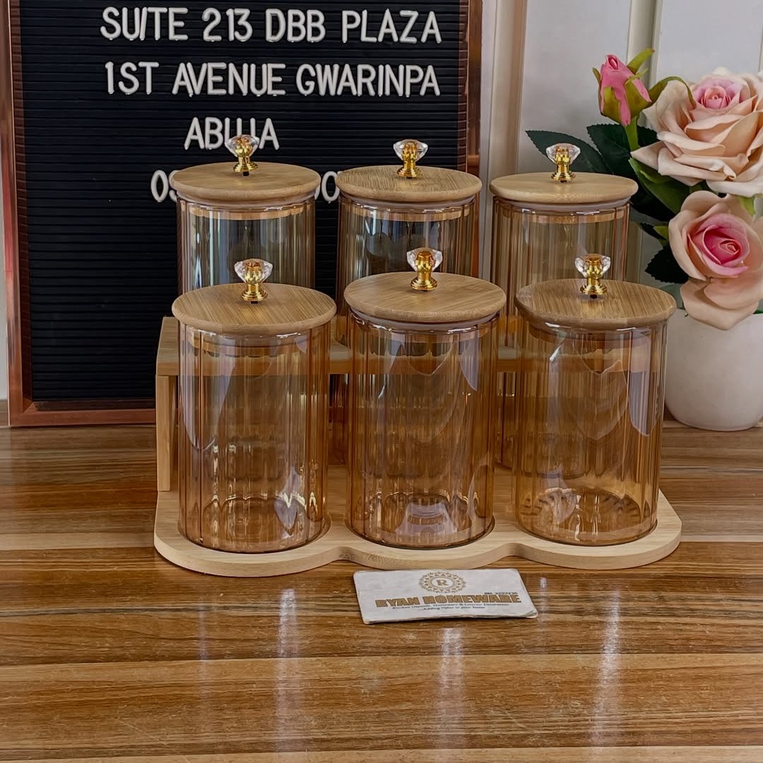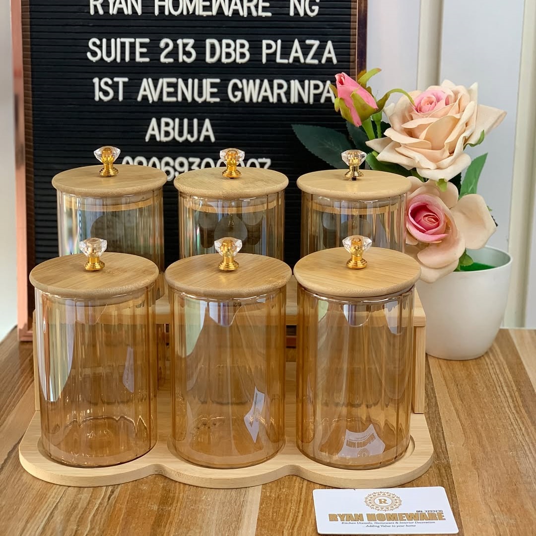 Add elegance and function to your kitchen or pantry with this premium 7-piece food storage container set. Crafted from high-quality, amber-toned glass with beautifully designed wooden lids and gold-accented crystal knob handles, these containers bring luxury and practicality together.