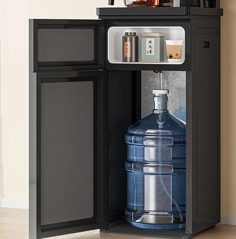 Bottom-loading water bucket system with sleek grey exterior panels, providing convenient refills and modern aesthetic appeal