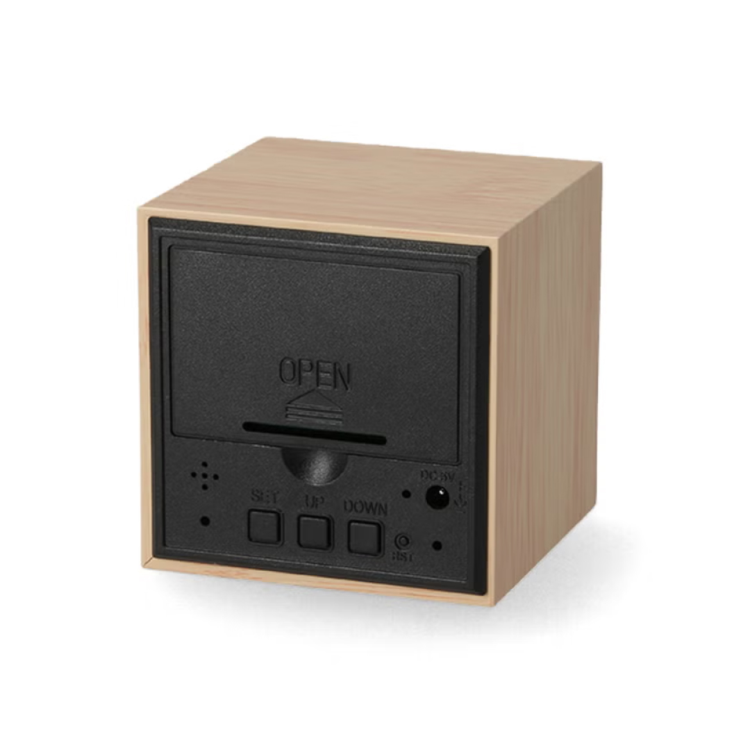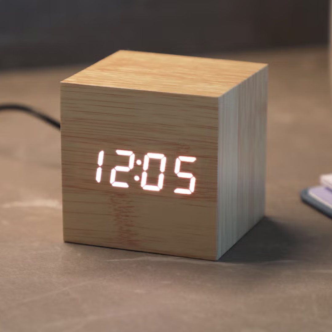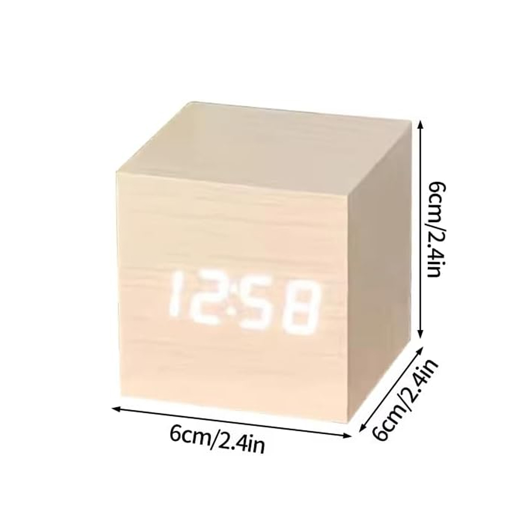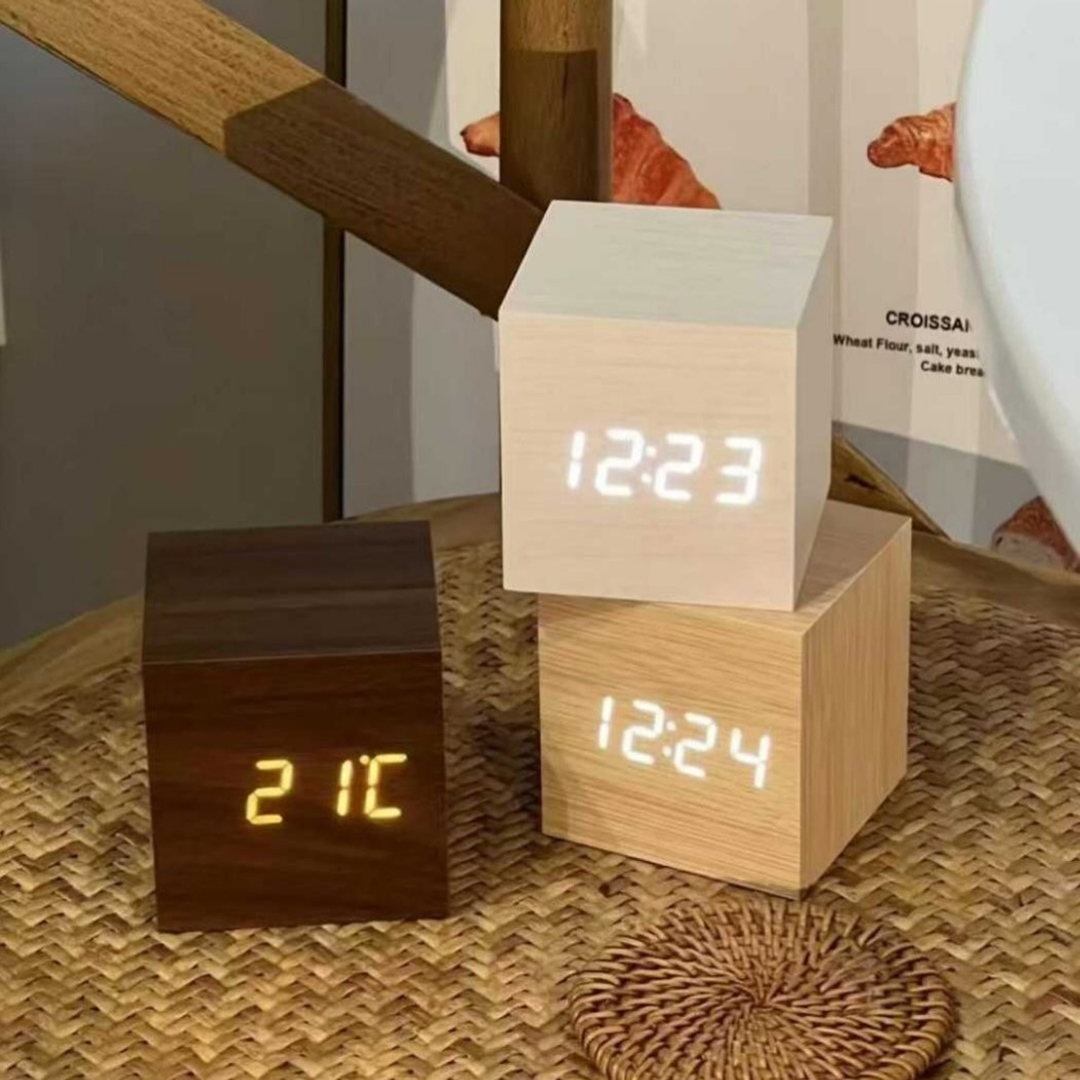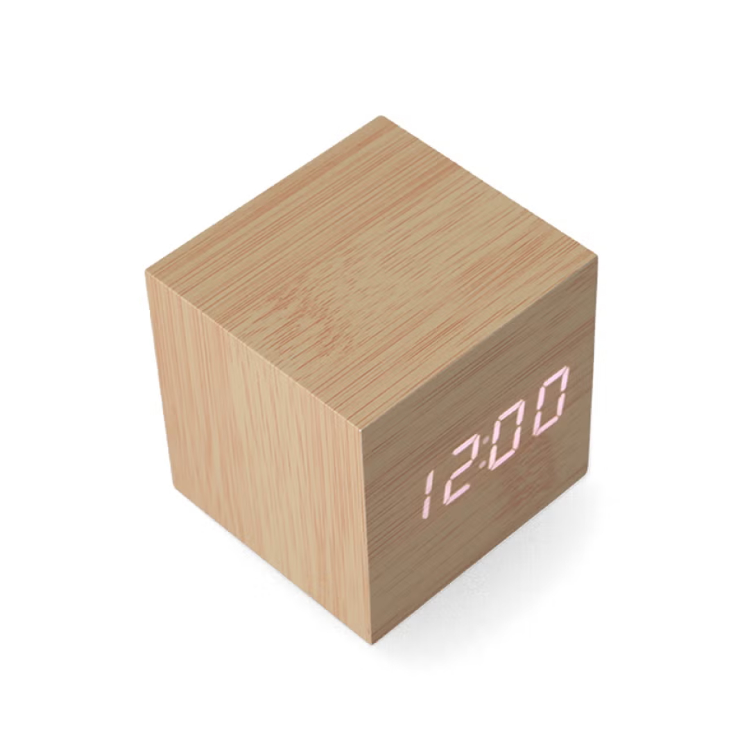Design: The clock has a minimalist, cube-shaped wooden design.