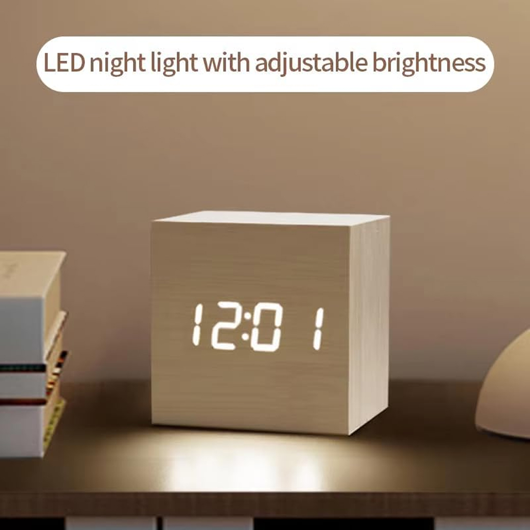 This is a Wooden Digital Alarm Clock with temperature and sound control features. Stay punctual and organized with this Digital Alarm Clock that displays time, date, and temperature. Perfect for any room, this LED clock serves as a functional and decorative desktop ornament.