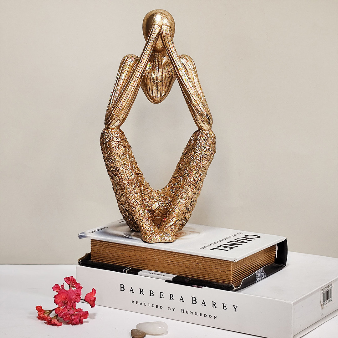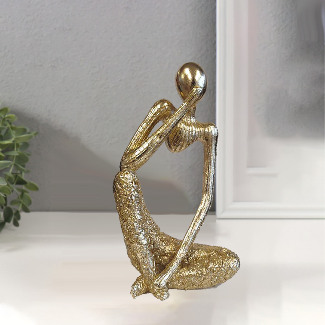 This is a gold-colored abstract thinking man decorative sculpture figurine, possibly made of gypsum or resin.