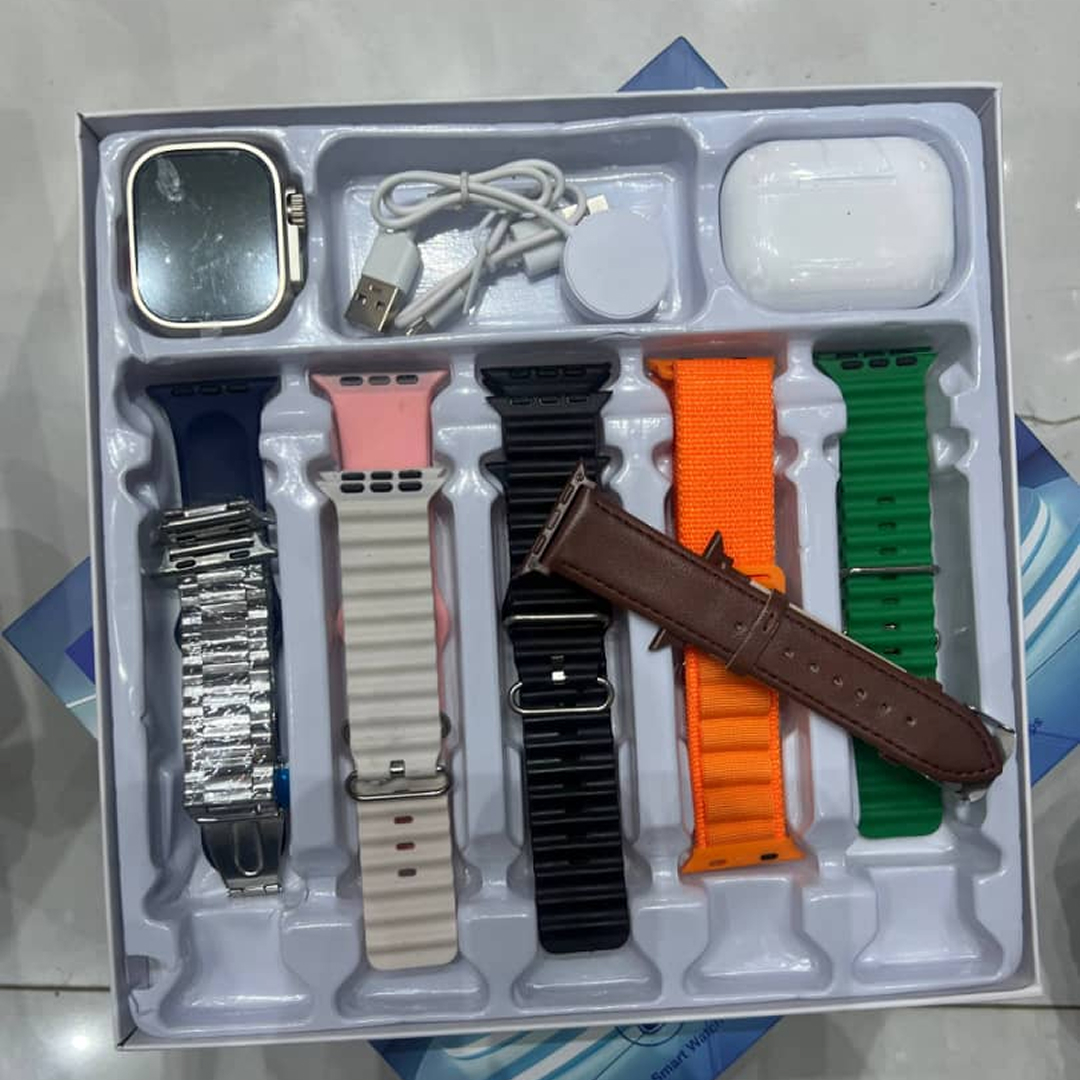 The bundle includes a smartwatch, wireless earpods, and several interchangeable watch straps.