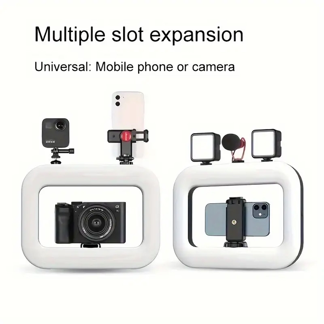 1.Professional Lighting Output: Enhance your video quality with the smartphone video rig with light, featuring ring-shaped illumination that minimizes facial shadows and softens skin tones, eliminating harsh overhead lighting effects.
