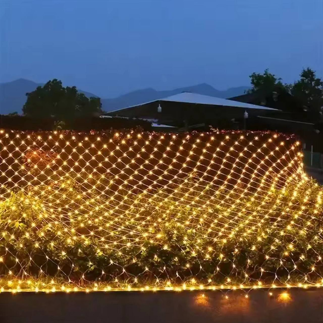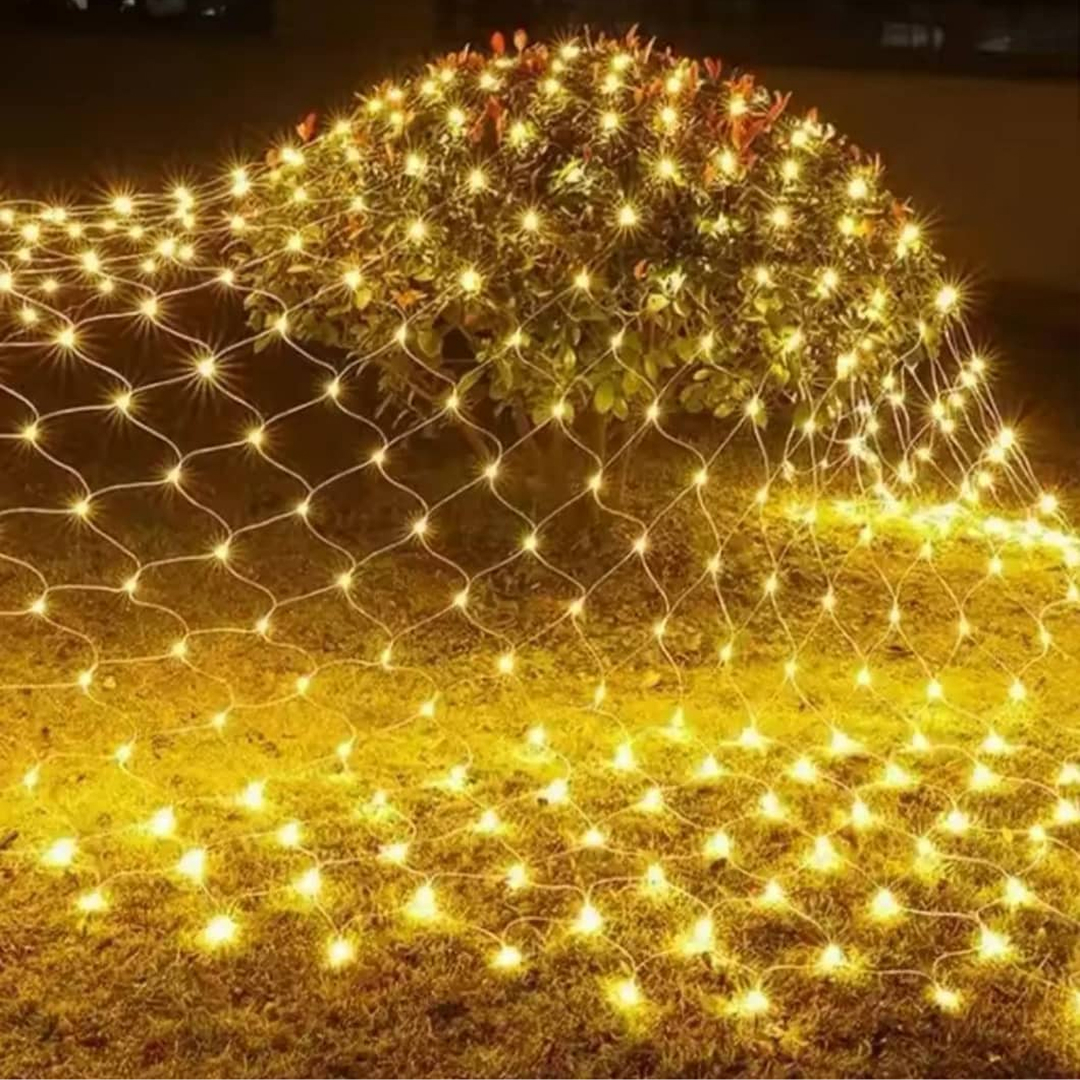 These are outdoor LED net lights, also known as mesh fairy lights or Christmas net lights. They are designed in a grid pattern to easily drape over bushes, shrubs, trees, or fences for even and quick coverage.