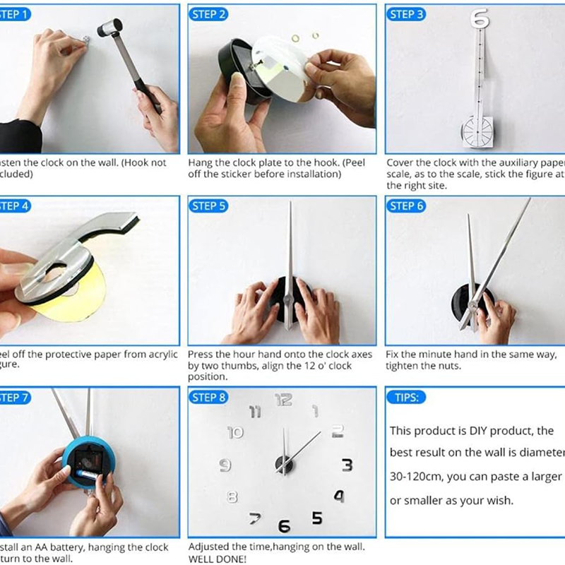 The wall decor clock comes with self-adhesive numbers and auxiliary scale ruler, also there is an installation video for your reference. So one can easily to install and enjoy the DIY fun of making your own unique house decorations for living room.